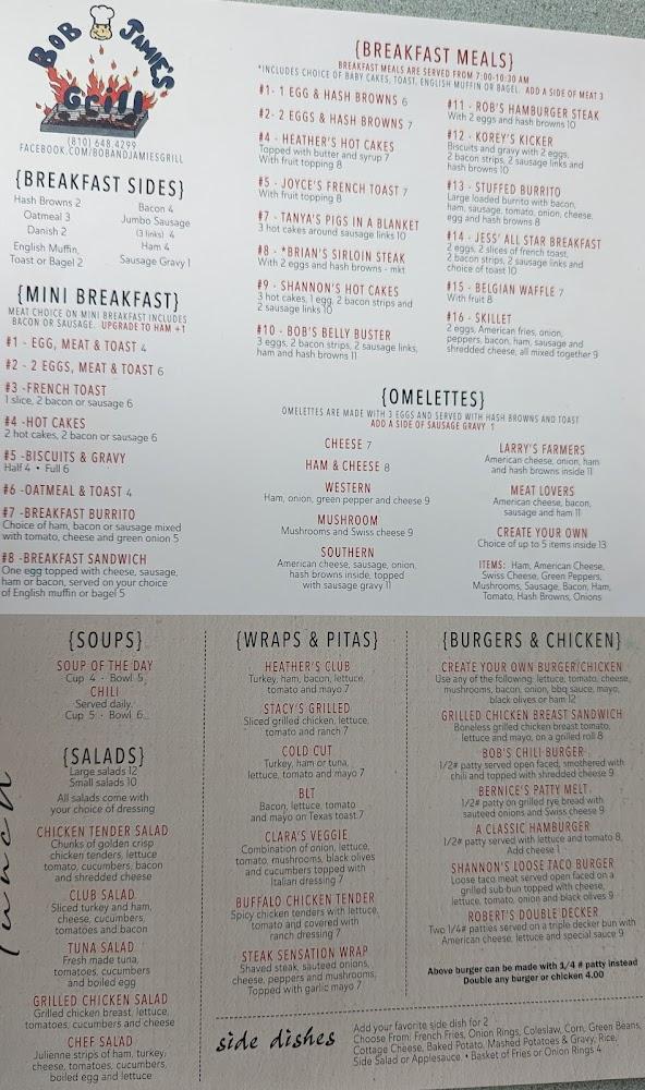 Welcome to Bob & Jamie's Grill, a beloved family-owned diner located in the heart of Sandusky, MI. Our diverse menu offers a wide range of delicious options perfect for any meal, from hearty breakfasts to satisfying dinners. Enjoy our excellent coffee and mouth-watering desserts in a relaxed atmosphere that welcomes everyone, including families and tourists. With accessible seating and amenities, we strive to ensure your visit is comfortable and enjoyable. Whether you're dining in, ordering takeout, or enjoying delivery, Bob & Jamie's is your go-to spot for a memorable meal. Join us for great food and great company!